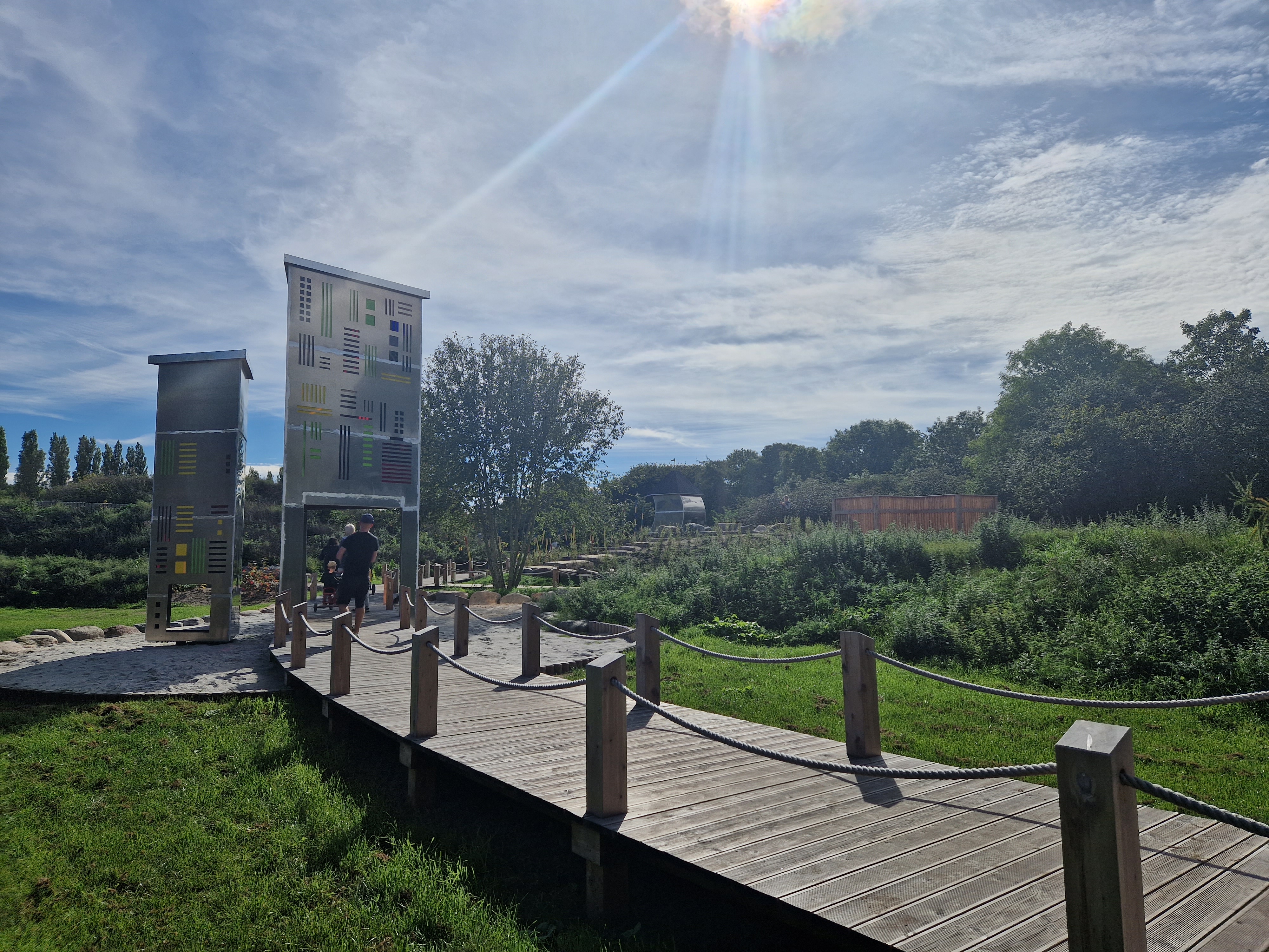 På legepladsen forbinder den cirkulære gangbro legepladsens organisk formede bakkelandskab, sneglehøjen, blomsterhaven, petanquebanen og meget mere.